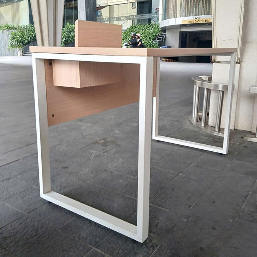 Khung chân bàn sử dụng sắt sơn tĩnh điện màu trắng, dạng khung hộp vuông tạo cảm giác vững chãi, bền bỉ và chống han gỉ trong quá trình sử dụng lâu dài. Thiết kế khung tối giản nhưng mạnh mẽ, giúp tổng thể chiếc bàn thêm phần thanh thoát và hiện đại.