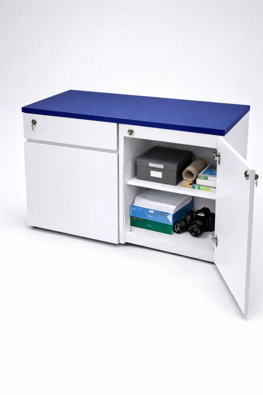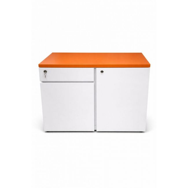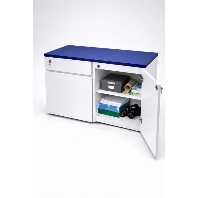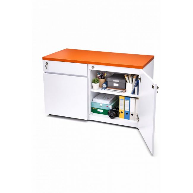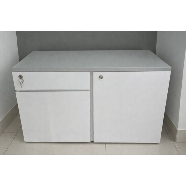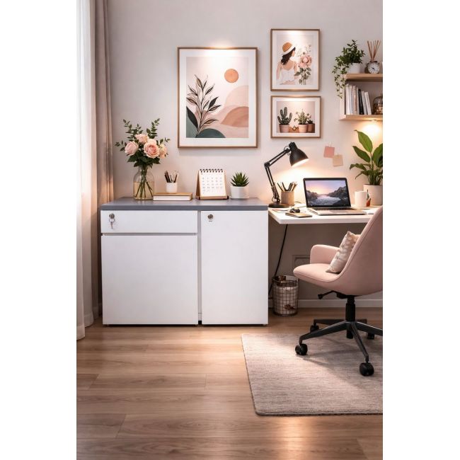Tủ gồm 2 hộc ngăn kéo và 1 cánh mở, bên trong có kệ chia ngăn giúp lưu trữ hồ sơ, tài liệu hoặc vật dụng cá nhân ngăn nắp.